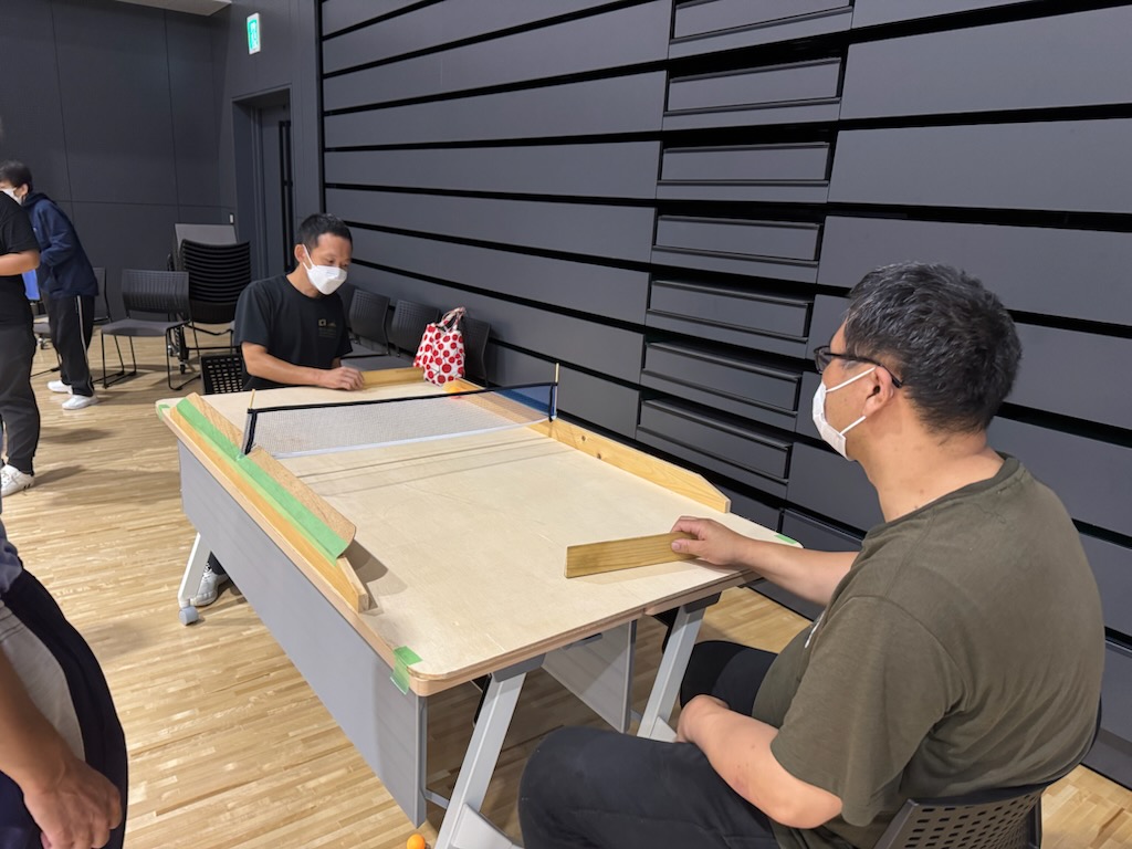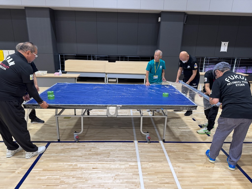 【番外編1】:昨年同様の卓球台の上には、ビニールのシートを敷き、卓球台を保護して実施しました。試合中、ラケットが引っかかるとか、ラケットが滑りやすくなるという事はありませんでした。