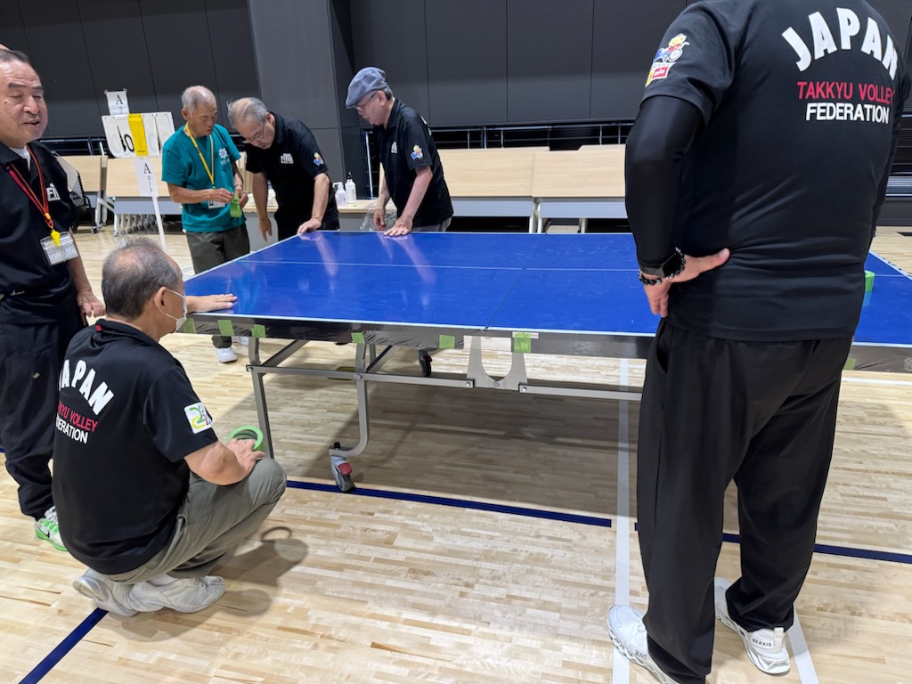 【番外編2】:下写真、富山県卓球バレー協会 谷口理事長さん手作りの練習台。足がなく、会議テーブルの上に乗せて使用中。1対1での打ち方の練習の為に考案されたものです。非売品です。試合前の肩慣らし練習に使っていました。