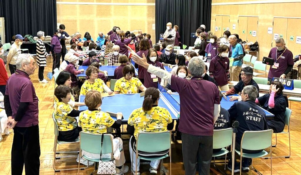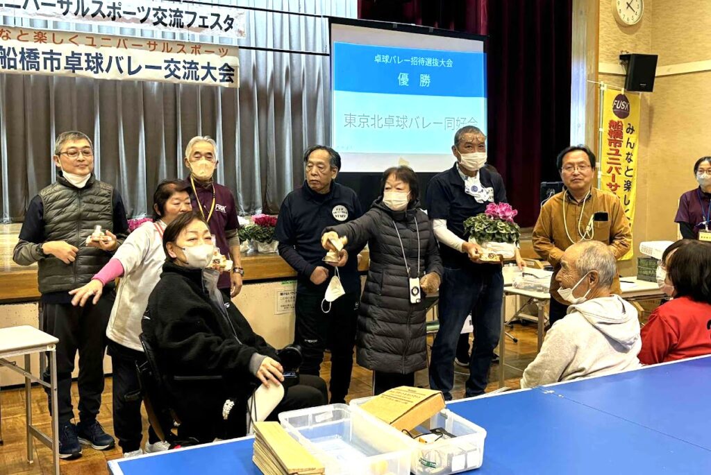 午後の「卓球バレー招待選抜大会」には、招待チームの東京北卓球バレー同好会を含む9チームが参加。試合運営は、船橋市ユニバーサルスポーツ協会所属の9名の2級審判員が中心となって進められ、スムーズで温かい雰囲気の大会となりました。