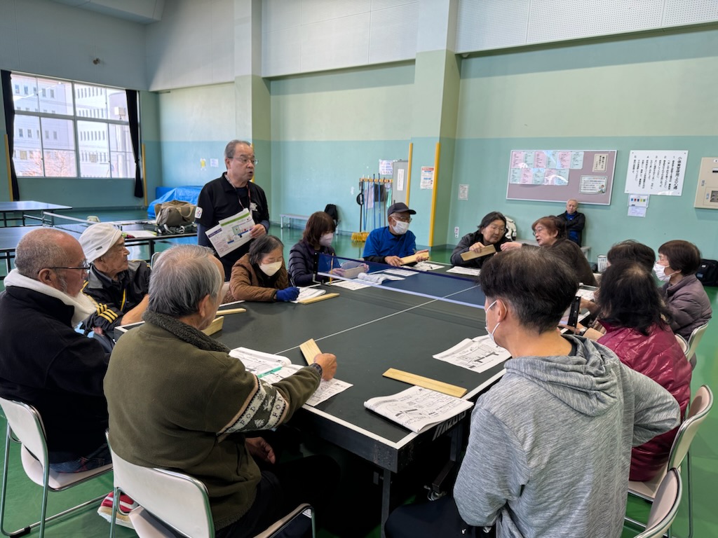 実技では、卓球台の周りに座って頂き用具の説明からルールの説明へと進められ、質問も多く聞かれみなさん真剣に見聞きされていました。